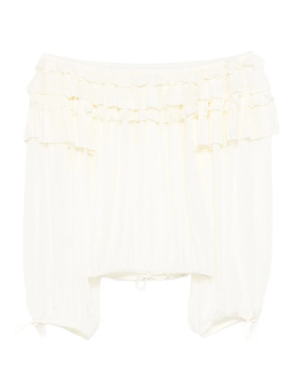ruffled blouse Highlights - Ivory - Long sleeves - Scoop neck - Elasticated cuffs Imported Composition Polyester 100% SIZE & FIT Model measurements Height 5 ft 10 in(1.77 m) Bust/Chest 29.33 in(74.5 cm) Hips 32.28 in(82 cm) Waist 24.01 in(61 cm) FittingInformation Designed to be unstructured, offering a loose fit throughout The elasticated shoulders offer movement and a comfortable fit Made from a lightweight non-stretch fabric Washing instructions Dry Clean Only