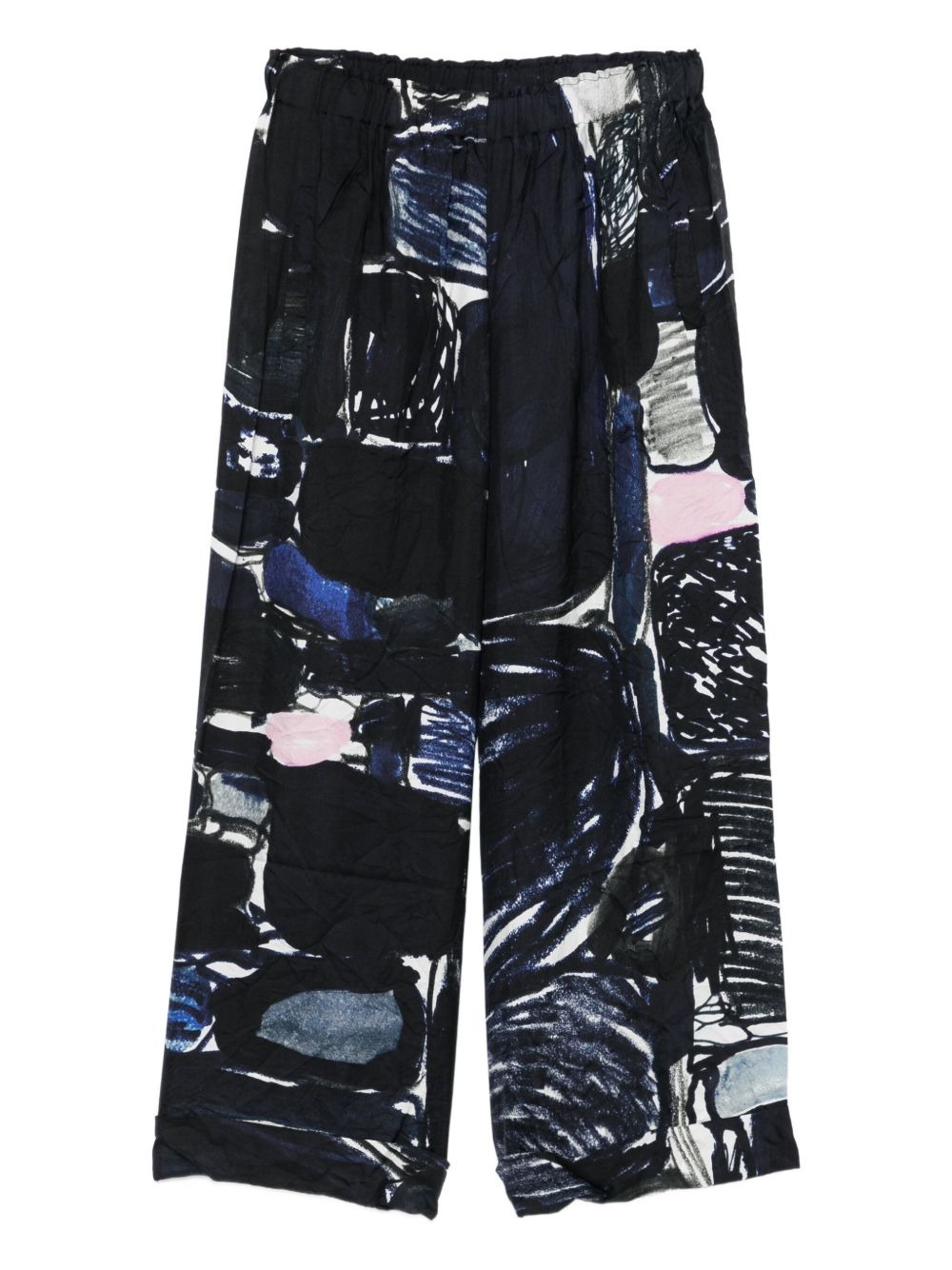 abstract-print elasticated-waist trousers Highlights - Blue - Silk - Abstract print - Elasticated waist - Wide leg - Cropped length Made in Italy Composition Silk 100% SIZE & FIT Measurement BACK RISE 14.56 in(37 cm) FRONT RISE 12.99 in(33 cm) Hem Width 14.17 in(36 cm) HIPS 47.24 in(120 cm) INSIDE LEG 24.4 in(62 cm) WAIST 25.19 in(64 cm) Washing instructions Dry Clean Only