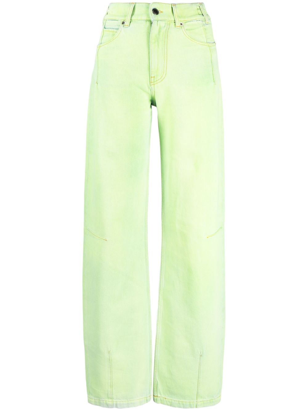 wide-leg denim jeans fluorescent yellow cotton washed denim tonal logo plaque wide leg belt loops front button and zip fastening classic five pockets Made in Italy Composition Cotton 100% SIZE & FIT Model measurements Height 5 ft 11 in(1.8 m) Bust/Chest 28.34 in(72 cm) Hips 35.43 in(90 cm) Waist 23.62 in(60 cm) FittingInformation This piece fits true to size. We recommend you get your regular size Designed to be fitted at the waist, loose over the leg Made with a mid-weight non-stretch fabric Washing instructions Machine Wash