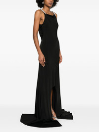 crystal-embellished gown Highlights - Black - Concealed side zip fastening - Double train - Cowl neck - Sleeveless Made in United Kingdom Composition Viscose 100%, glass 100% SIZE & FIT Model measurements Height 5 ft 11 in(1.8 m) Bust/Chest 32.67 in(83 cm) Hips 35.82 in(91 cm) Waist 25.98 in(66 cm) FittingInformation Designed for a close fit throughout Made from a midweight non-stretch fabric, this piece offers minimal elasticity when worn