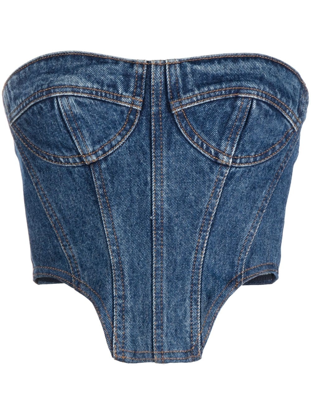 denim bustier crop top Highlights - Indigo blue - Cotton - Denim - Corset style - Exposed rear zip fastening - Sweetheart neck - Strapless - High-low hem Made in Italy Composition Cotton 100% SIZE & FIT Model measurements Height 5 ft 10 in(1.77 m) Bust/Chest 34.64 in(88 cm) Hips 35.43 in(90 cm) Waist 24.8 in(63 cm) FittingInformation Designed for a very close and sculpting fit Cropped in length Sturdy and hard-wearing, this denim piece offers no stretch This piece fits true to size – take your usual size Washing instructions Dry Clean Only