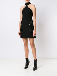 metallic detailing halterneck dress Black wool blend metallic detailing halterneck dress from David Koma. Made in United Kingdom Composition Lining: Acrylic 96%, Lyocell 4% Wool 93%, Polyamide 5%, Spandex/Elastane 2% SIZE & FIT Model measurements Height 5 ft 10 in(1.77 m) Bust/Chest 33.85 in(86 cm) Hips 35.03 in(89 cm) Waist 24.01 in(61 cm) Washing instructions Dry Clean Only