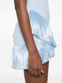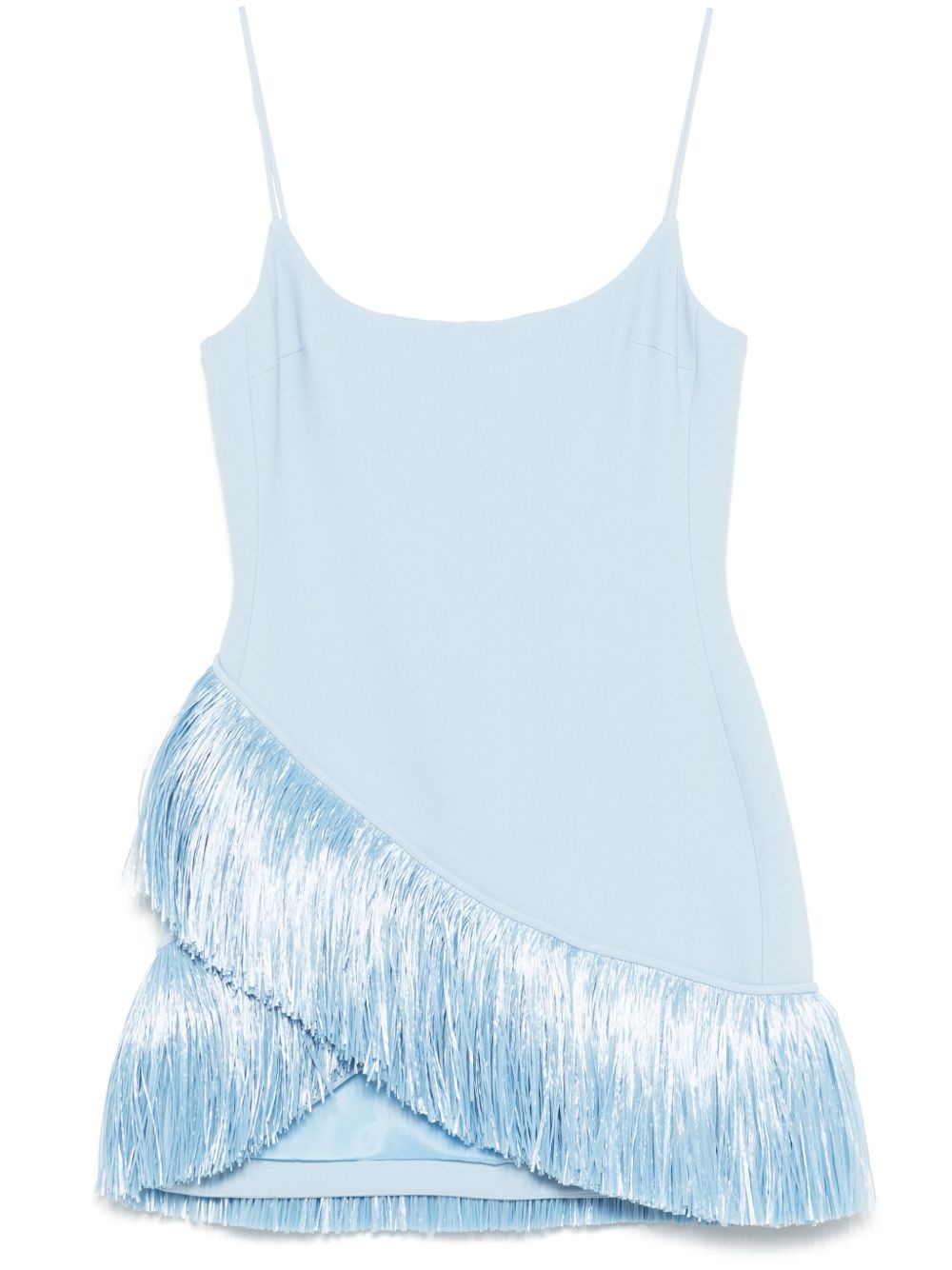 raffia fringe-trim mini dress Highlights - Sky blue - Concealed rear hook and zip fastening - Scoop neck - Spaghetti straps - Asymmetric hem Made in United Kingdom Composition Outer: Viscose 50%, Acetate 47%, Spandex/Elastane 3% Lining: Polyester 97%, Spandex/Elastane 3% SIZE & FIT Model measurements Height 5 ft 10 in(1.78 m) Bust/Chest 31.49 in(80 cm) Hips 37 in(94 cm) Waist 23.62 in(60 cm) FittingInformation Designed for a slim fit that sits just away from the body offering a close yet comfortable fit The dart stitching adds structure and a closer fit in the torso of this piece Made from a midweight fabric