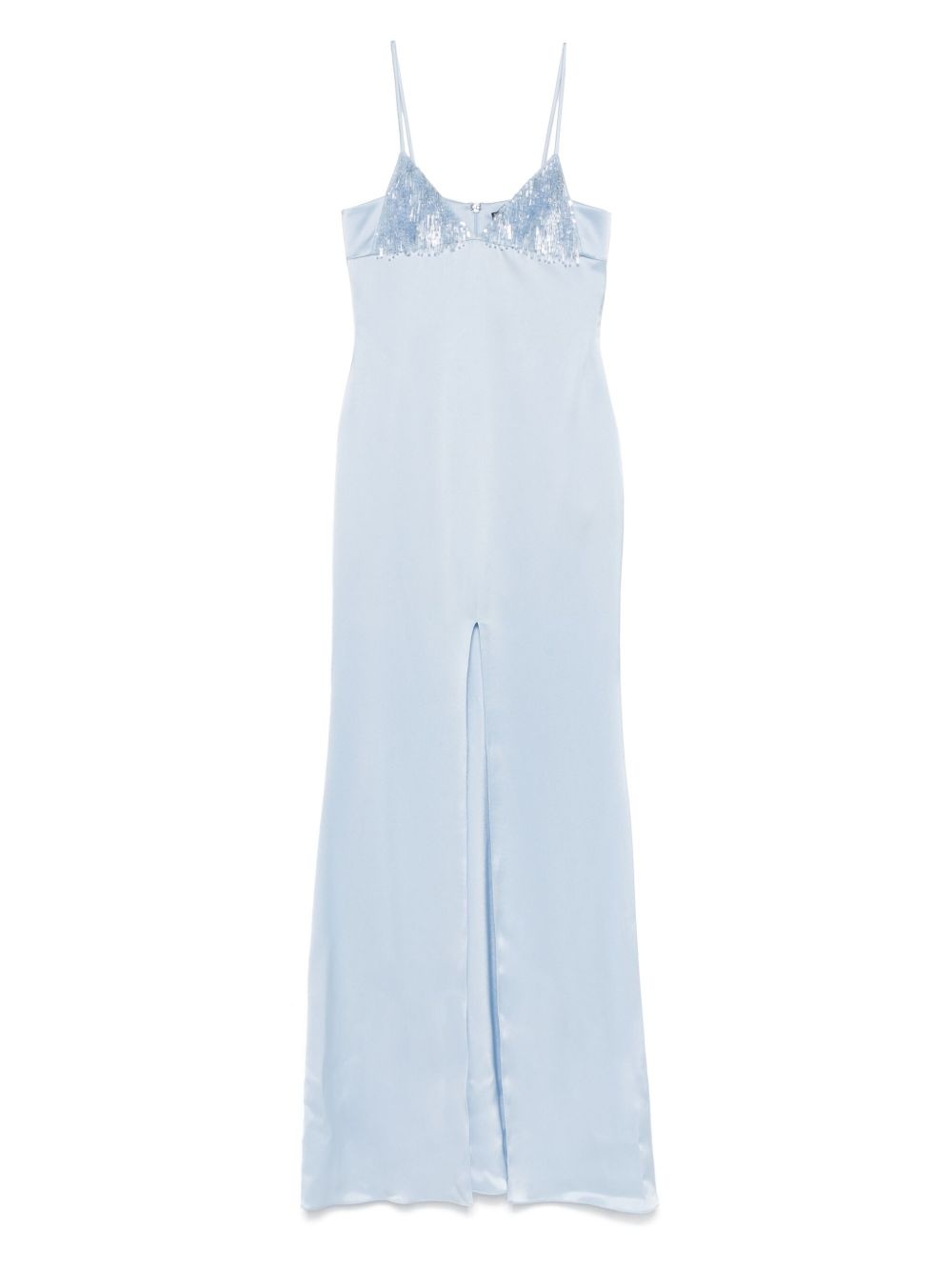 satin maxi dress Highlights - Light blue - Rear zip fastening - V-neck - Sleeveless Made in United Kingdom Composition Lining: Viscose 64%, Polyester 36% Outer: Triacetate 78%, Polyester 22% SIZE & FIT Model measurements Height 5 ft 11 in(1.8 m) Bust/Chest 31.49 in(80 cm) Hips 36.61 in(93 cm) Waist 24.4 in(62 cm) FittingInformation Designed for a slim fit that sits just away from the body offering a close yet comfortable fit Made from a midweight non-stretch fabric, this piece offers minimal elasticity when worn Washing instructions Do Not Wash/Do Not Dry Clean