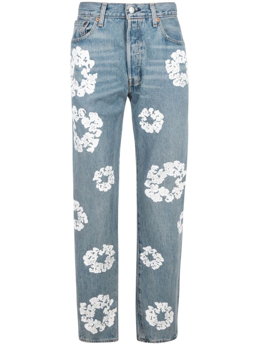 x Levi's Cotton Wreath-print straight-leg jeans Part of a joint collection with Levi's, these jeans are cut to a classic straight leg and adorned with the signature Cotton Wreath print, a pattern designed by the founder of Denim Tears. Tremaine Emory aims to 'reclaim the negative and racist past associated with cotton' by transforming it into art in his designs. Highlights - Light blue - Cotton - Applique logo - Cotton wreath print - Belt loops - Front button fastening - Classic five pockets - Straight leg Imported Composition Cotton 100%