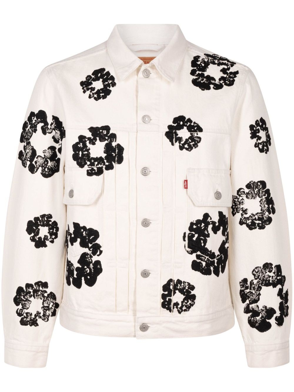 x Levi's wreath-print denim jacket Denim Tears presents this white denim jacket in collaboration with Levi's, which is characterised by its all-over wreath print in contrasting black. It's cut from cotton in the original Type II Trucker design with a front button fastening and two flap pockets below the chest. Highlights - White/black - Cotton - Denim - All-over graphic print - Classic collar - Front button fastening - Two chest flap pockets - Long sleeves - Buttoned cuffs - Straight hem Imported Composition Cotton 100% Washing instructions Read Manufacturer Guidelines