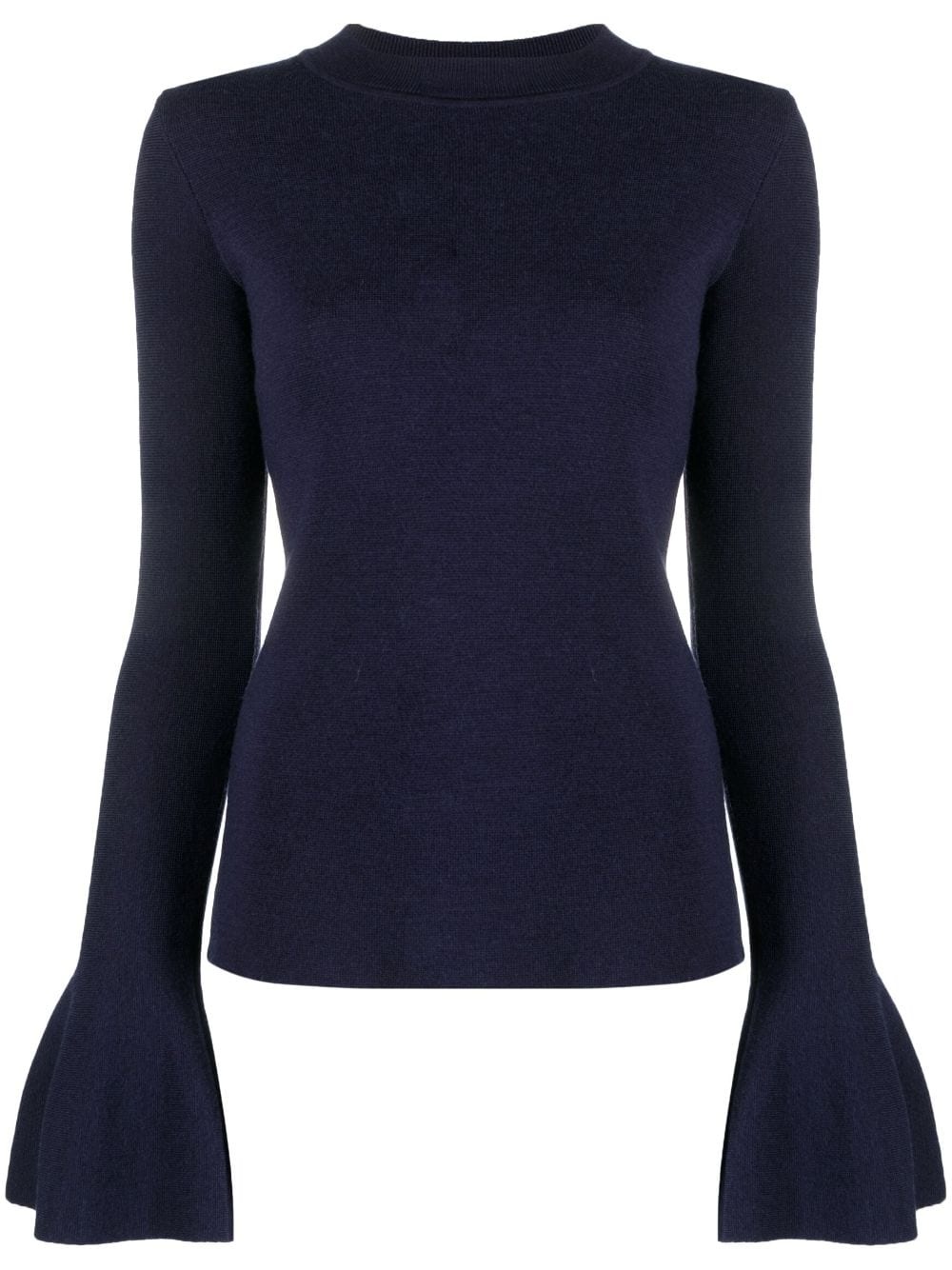 Joan flared-cuff knitted jumper Highlights - Navy blue - Wool blend - Flared cuffs - Crew neck - Long sleeves - Straight hem Imported Composition Wool 50%, Viscose 50% SIZE & FIT Model measurements Height 5 ft 10 in(1.78 m) Bust/Chest 32.67 in(83 cm) Hips 35.43 in(90 cm) Waist 23.22 in(59 cm) FittingInformation Designed for a slim fit that sits just away from the body offering a close yet comfortable fit Made with a midweight knit, this piece offers some stretch This piece fits true to size – take your usual size