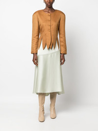 Wade ribbed satin jacket Highlights - Camel brown - Cotton blend - Satin finish - Fine ribbed - Round neck - Front button fastening - Shoulder pads - Long sleeves - Scallop hem Imported Composition Outer: Cotton 69%, Viscose 31% Lining: Viscose 100% SIZE & FIT Model measurements Height 5 ft 10 in(1.78 m) Bust/Chest 31.49 in(80 cm) Hips 37 in(94 cm) Waist 23.62 in(60 cm) FittingInformation Designed for a slim fit that sits just away from the body offering a close yet comfortable fit The internal shoulder pads offer a structured shape Made from a midweight non-stretch fabric This piece fits true to size – take your usual size