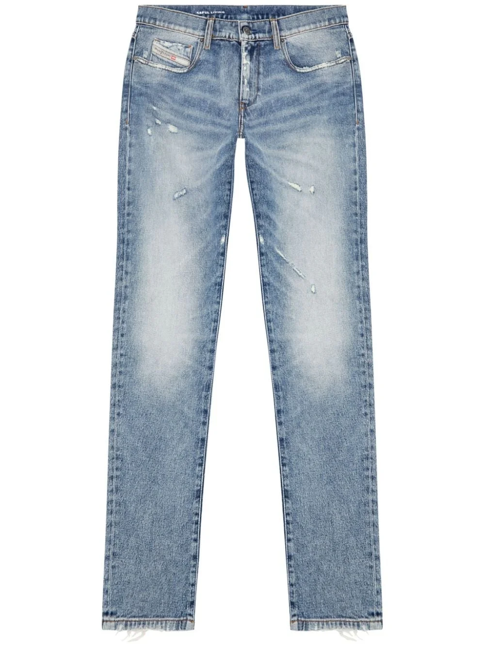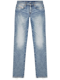 2019 D-Strukt slim-cut jeans Highlights - Blue - Stretch-cotton - Denim - Faded effect - Logo tag - Logo patch to the rear - Embroidered logo to the rear - Ripped detailing - Belt loops - Concealed fly and button fastening - Classic five pockets - Slim cut - Frayed hem Made in Italy Composition Cotton 77%, Recycled Cotton 22%, Spandex/Elastane 1%