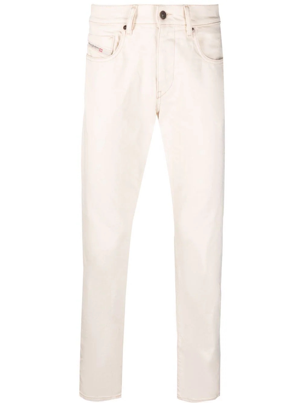 2019 D-Strukt 09B94 slim-cut jeans Highlights - Off-white cotton-blend 2019 slim-cut jeans from diesel featuring front button fastening, two diagonal pockets to the sides, two rear patch pockets and slim cut. . Imported Composition Cotton 99%, Spandex/Elastane 1% SIZE & FIT Model measurements Height 6 ft 1 in(1.85 m) Bust/Chest 33.46 in(85 cm) Hips 38.18 in(97 cm) Waist 31.49 in(80 cm) FittingInformation This piece fits true to size. We recommend you get your regular size Designed for a slim fit at the waist and loose over the leg Made with a mid-weight stretch fabric Washing instructions Machine Wash