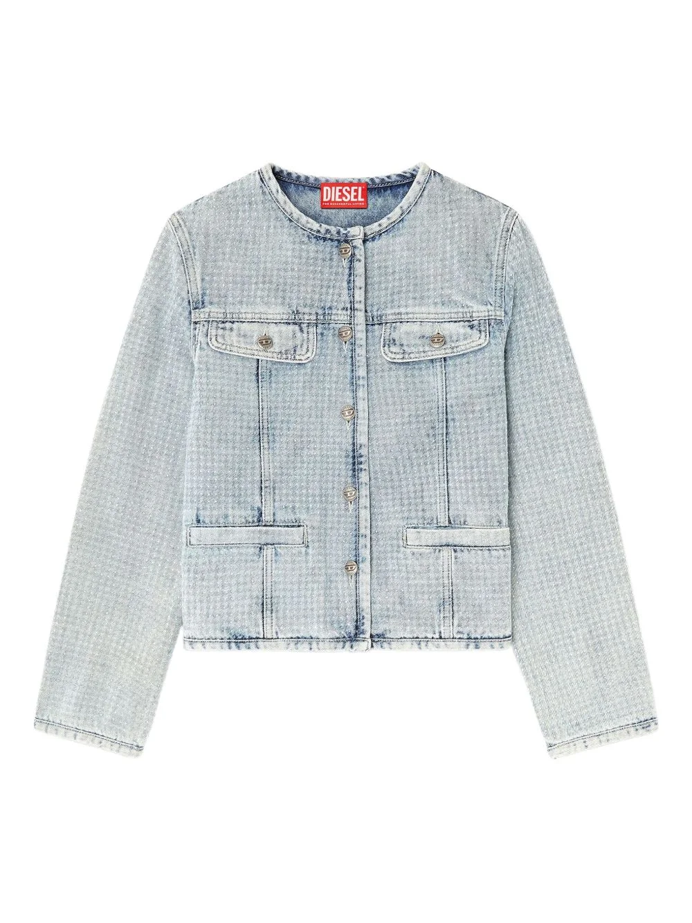 button-fastening denim jacket Highlights - Light blue - Houndstooth pattern - Welt pockets - Round neckline - Stonewashed effect - Rhinestones Imported Composition Cotton 100% Washing instructions Read Manufacturer Guidelines