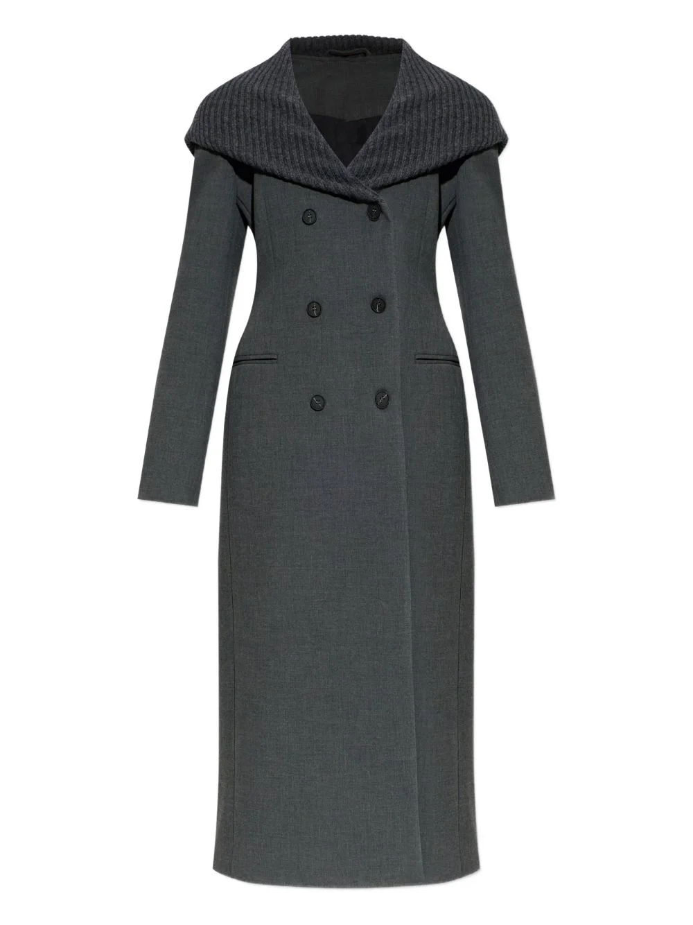 buttoned coat Highlights - Grey - Double-breasted button fastening - Front welt pockets - Long sleeves Imported Composition Polyester 100% Washing instructions Read Manufacturer Guidelines