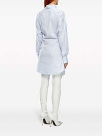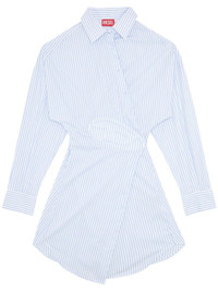 D-SIZEN-N2 Diesel puts its signature twist on this D-Sizen shirt dress in a literal sense – the wrap front is secured with an Oval D touch-strap applique. It’s cut from striped blue poplin with an asymmetric hem and drop shoulders to enhance the louche sleeves. Highlights - Light blue/white - Cotton blend - Poplin texture - Wrap design - Vertical stripe pattern - Spread collar - Long sleeves - Buttoned cuffs - Oval d logo plaque - Asymmetric hem - Front button and touch-strap fastening Imported Composition Cotton 67%, Polyamide 30%, Elastane 3% Washing instructions Read Manufacturer Guidelines