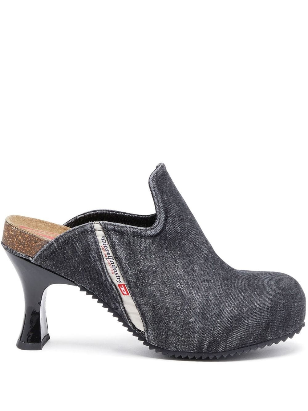 D-Woodstock W 80mm denim mules Designed for a Western-inspired look, Diesel's D-Woodstock mules boast a patchwork denim upper. They sit atop a sculpted high heel with a cork midsole and feature a signature logo tag at the side for a branded flair. Highlights - Black - Cotton - Denim - Patchwork design - Round toe - Branded insole - Cork midsole - High sculpted heel Imported Composition Cotton 100%