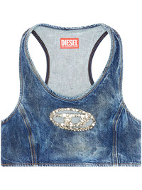 De-Top-Fsd crystal-embellished top Highlights - Indigo blue - Cotton blend - Denim - Crystal embellished cut-out d logo - Scoop neck - Sleeveless - Straight hem - Cropped - Side zip fastening Imported Composition Cotton 79%, Hemp 20%, Elastane 1% SIZE & FIT Model measurements Height 5 ft 9 in(1.76 m) Bust/Chest 31.88 in(81 cm) Hips 35.43 in(90 cm) Waist 24.8 in(63 cm) FittingInformation Designed for a close fit throughout Constructed from stretch denim, this piece offers a stretch fit with durability This piece fits small – take one size up