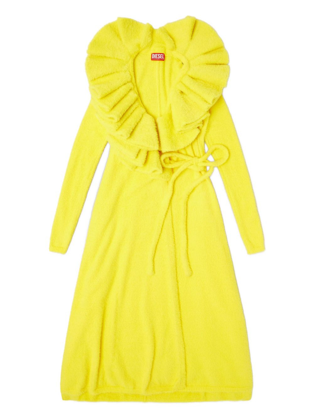 Fluffy ruffled-neck midi dress Highlights - Yellow - Ruffled neckline - Long sleeves - Wrap-style bodice - Midi length Made in Italy Composition Polyamide 100% Washing instructions Read Manufacturer Guidelines
