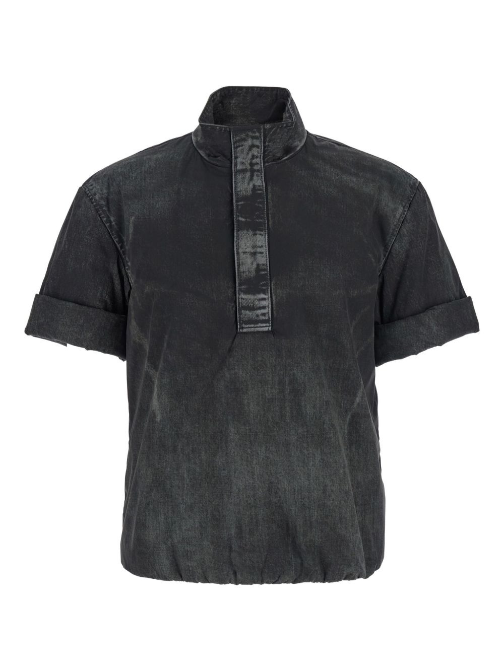 high-neck denim shirt Highlights - Black - Short sleeves - High neck - Elasticated hem - Button placket - Faded wash Imported Composition Polyamide 93%, Elastane 7% Washing instructions Read Manufacturer Guidelines