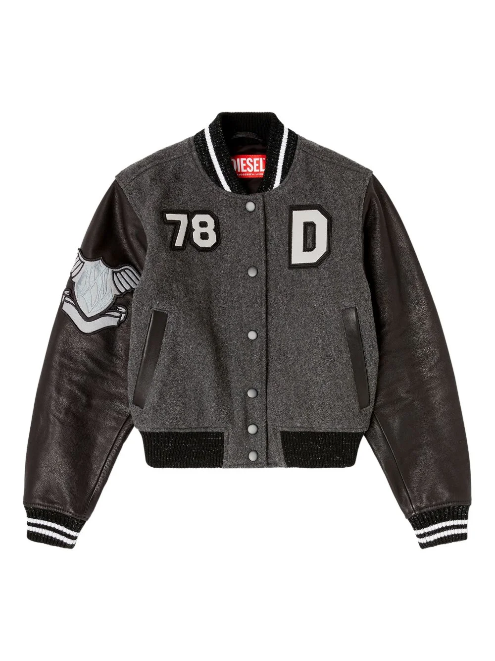L-Real-Cp phoenix-embroidered jacket Highlights - Dark grey - Leather sleeves - Phoenix embroidery - Logo-inspired patches - Ribbed neck and cuffs Imported Composition Outer: Leather 100%, Wool 81%, Polyamide 19% Washing instructions Read Manufacturer Guidelines