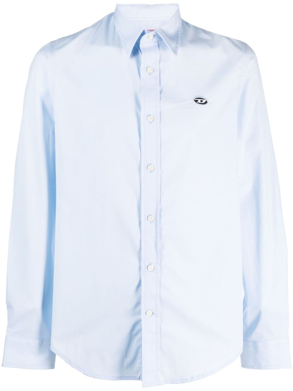 logo-patch long-sleeve shirt Highlights - Light blue - Stretch-cotton - Logo patch at the chest - Classic collar - Front button fastening - Long sleeves - Buttoned cuffs - Curved hem Made in Italy Composition Cotton 97%, Spandex/Elastane 3% SIZE & FIT Model measurements Height 6 ft 1 in(1.86 m) Bust/Chest 37.79 in(96 cm) Hips 38.58 in(98 cm) Waist 33.85 in(86 cm) FittingInformation Designed for a regular fit, allowing for a comfortably loose fit throughout the body Made from a midweight stretch fabric, this piece offers elasticity and flexibility when worn This piece fits true to size – those with broad shoulders may wish to take one size up Washing instructions Machine Wash