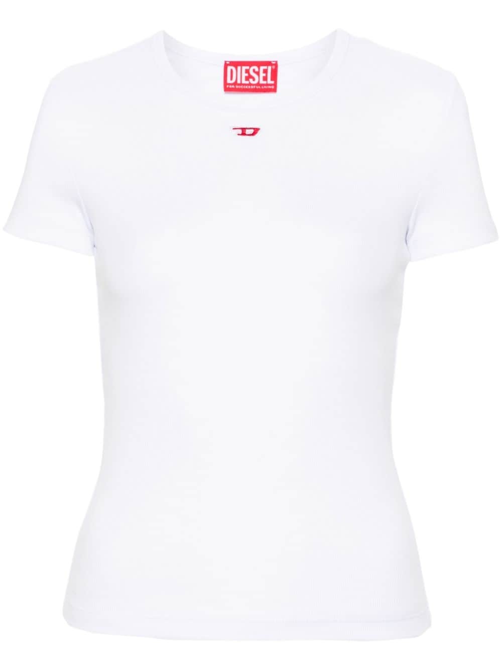 logo-patch T-shirt Highlights - White - Cotton blend - Fine knit - Crew neck - Cap sleeves - Logo patch to the front - Authenticity qr code - Straight hem Imported Composition Cotton 94%, Elastane 6% SIZE & FIT Model measurements Height 5 ft 10 in(1.77 m) Bust/Chest 32.28 in(82 cm) Hips 35.03 in(89 cm) Waist 25.19 in(64 cm) FittingInformation Designed for a close fit throughout Made from a midweight stretch fabric, this piece offers elasticity and flexibility when worn This piece fits true to size – take your usual size
