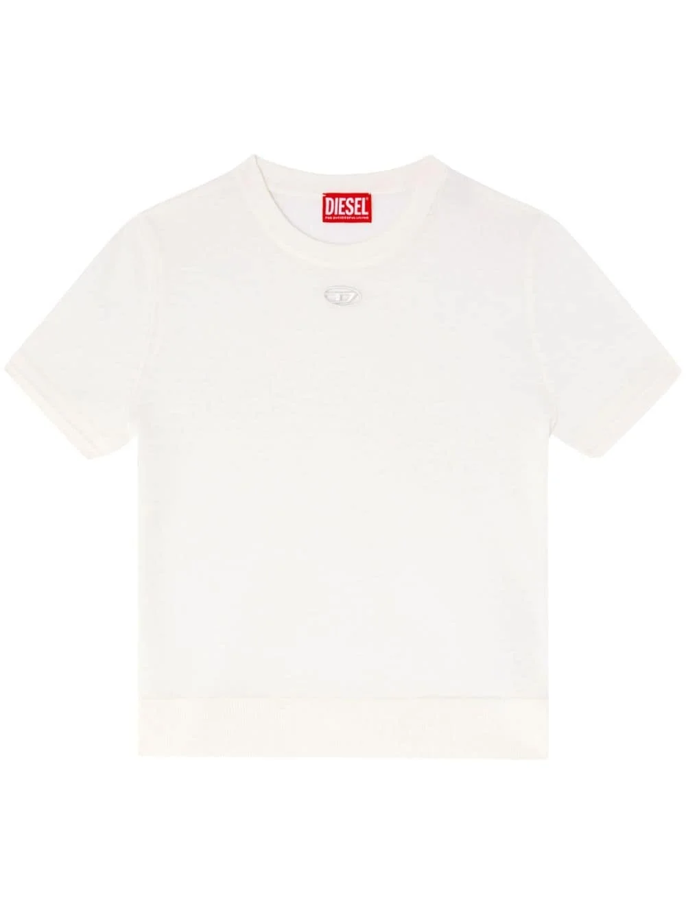 M-Aline knitted top Highlights - White - Wool - Fine knit - Ribbed trim - Crew neck - Embroidered logo - Cut-out detailing - Short sleeves Imported Composition Wool 100% Washing instructions Read Manufacturer Guidelines