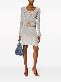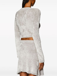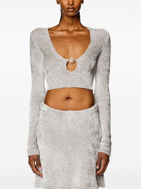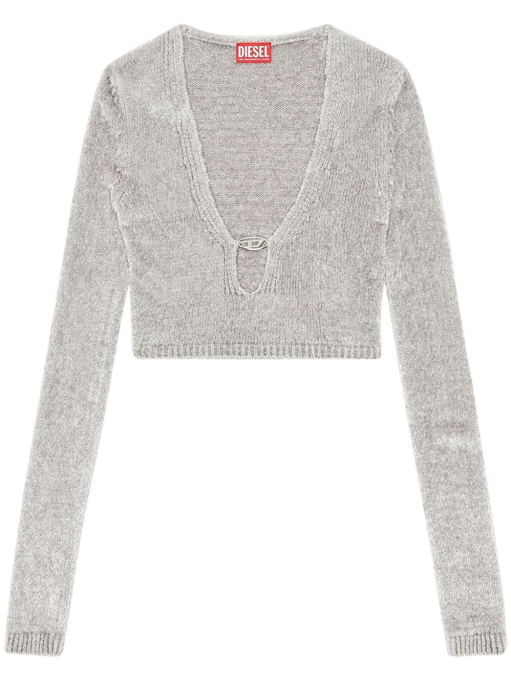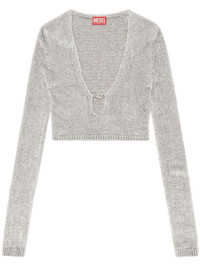 M-Cherry chenille crop top This chenille jumper embodies Diesel's affinity for sheen compositions. It's knitted in a slim, cropped silhouette, adorned with a small Oval D logo connecting the plunging neckline. Highlights - Light grey - Chenille texture - Silver-tone logo plaque - Cut-out detailing - Scoop neck - Long sleeves - Straight hem - Cropped Made in Italy Composition Viscose 72%, Polyamide 28% SIZE & FIT Measurement BUST 29.92 in(76 cm) Washing instructions Read Manufacturer Guidelines