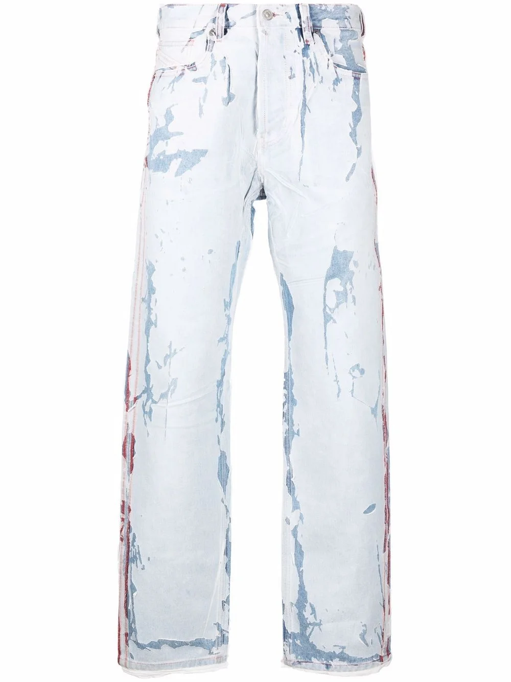 Peel-Off-Effect straight-leg jeans blue cotton distressed effect side stripe detailing logo patch to the rear straight leg belt loops front button and zip fastening classic five pockets Made in Italy Composition Cotton 100% SIZE & FIT Model measurements Height 6 ft 2 in(1.89 m) Bust/Chest 35.43 in(90 cm) Hips 36.61 in(93 cm) Waist 28.74 in(73 cm) FittingInformation This piece fits true to size. We recommend you get your regular size Cut for a slim fit Made with a mid-weight non-stretch fabric Washing instructions Hand Wash