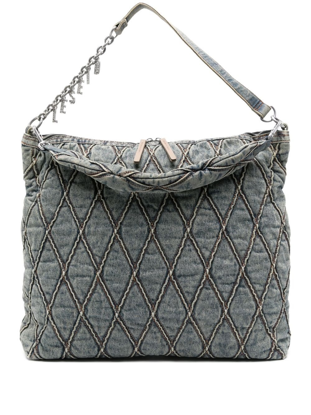 quilted chain-embellished shoulder bag Highlights - Blue - Quilted diamond pattern - Chain strap - Letter charms - Zip fastening - Top handle Imported Composition Fabric 100% SIZE & FIT Model measurements Height 5 ft 9 in(1.75 m) Bust/Chest 32.67 in(83 cm) Hips 36.22 in(92 cm) Waist 24.8 in(63 cm) Measurement DEPTH 4.33 in(11 cm) HEIGHT 16.14 in(41 cm) STRAP 20.07 in(51 cm) WIDTH 20.47 in(52 cm)