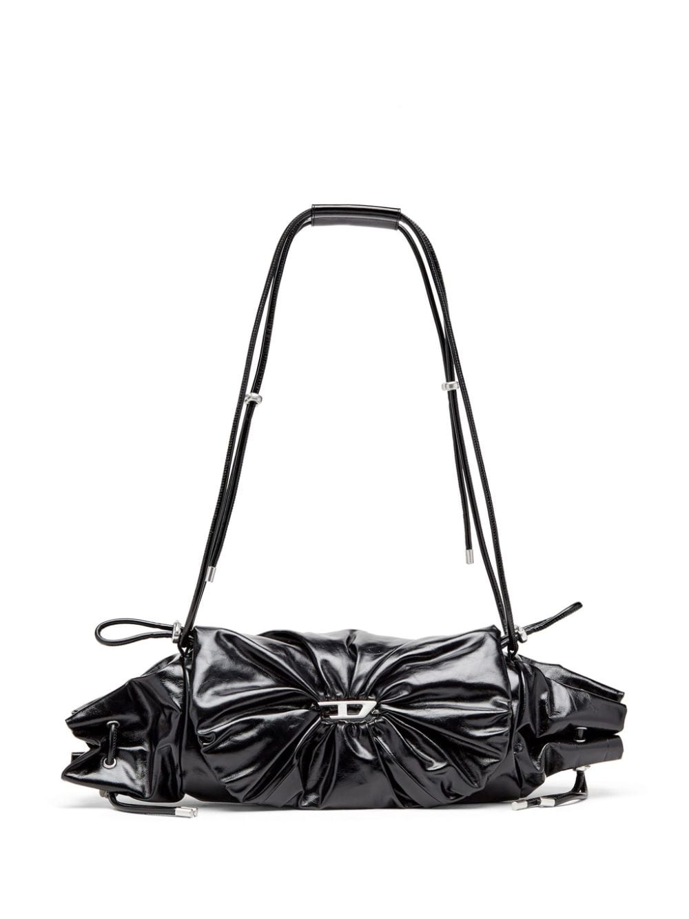 Scrunch-D shoulder bag Highlights - Black - Calf leather - High-shine finish - Gathered detailing - Tie-fastening straps - Logo plaque - Foldover top - Top drawstring fastening - Main compartment Imported Composition Outer: Calf Leather 100%