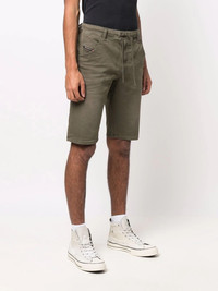 drawstring-waist denim shorts Highlights - Khaki-green - Cotton-calf leather blend - Slim cut - Drawstring fastening - Two diagonal pockets to the sides - Knee-length Imported Composition Calf Leather 100%, Cotton 90%, Polyester 8%, Spandex/Elastane 2% SIZE & FIT Model measurements Height 6 ft 2 in(1.89 m) Bust/Chest 35.03 in(89 cm) Hips 38.18 in(97 cm) Waist 29.92 in(76 cm) FittingInformation This piece fits true to size. We recommend you get your regular size Cut for a slim fit Made with a mid-weight stretch fabric Washing instructions Machine Wash