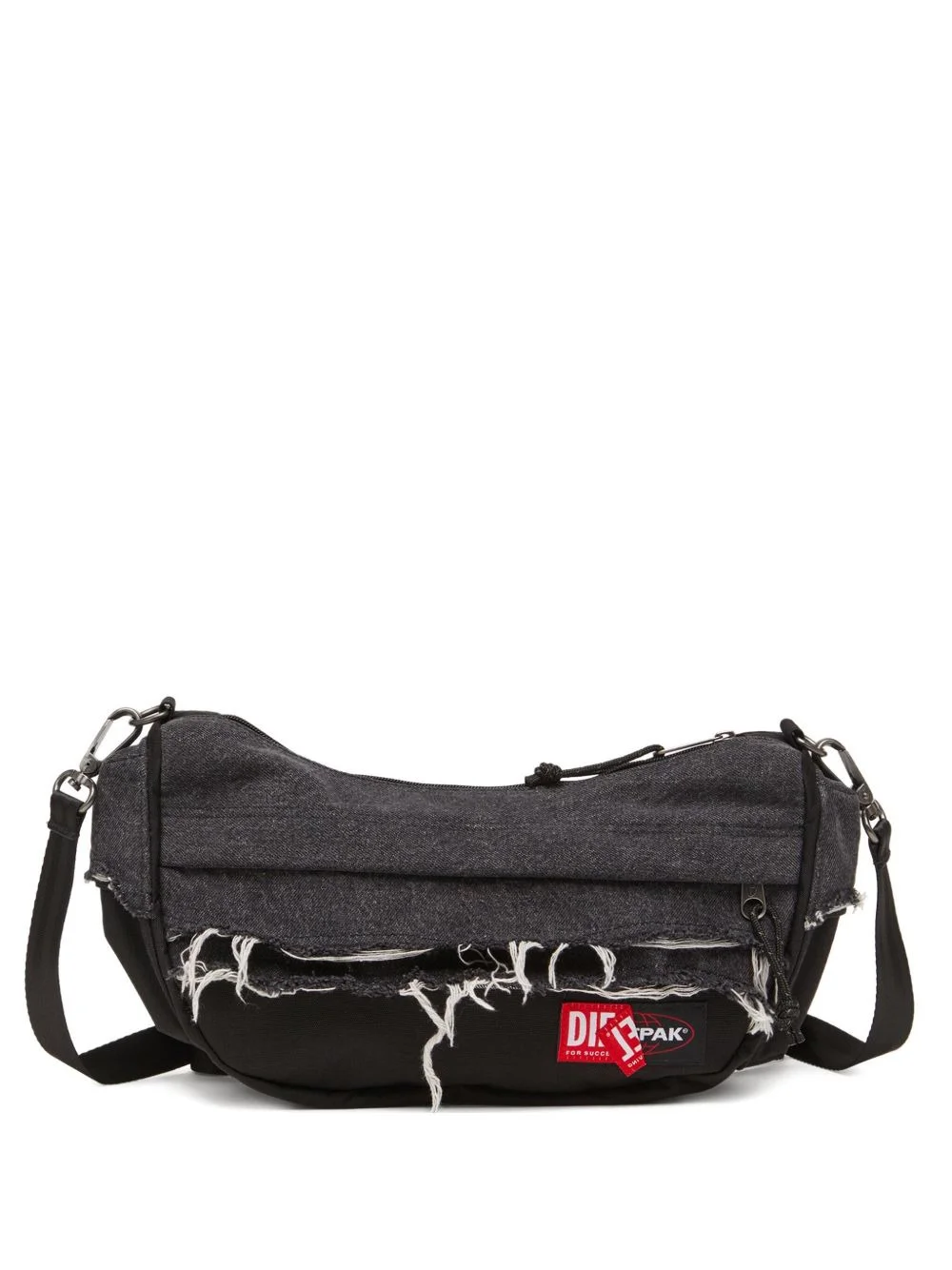 x Eastpak frayed denim shoulder bag Highlights - Black - Frayed construction - Adjustable strap - Zip fastening - Curved shape - Logo patch Imported Composition Outer: Polyamide 85%, Cotton 15%
