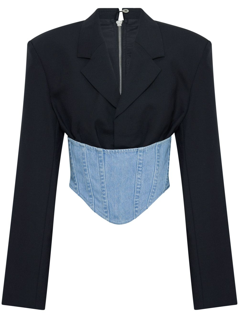 cropped corset-style blazer Highlights - Black - Cotton-wool blend - Corset style - Rear zip fastening - Peak lapels - Long sleeves - Cropped - Asymmetric hem Imported Composition Wool 100%, Cotton 100% Washing instructions Dry Clean Only