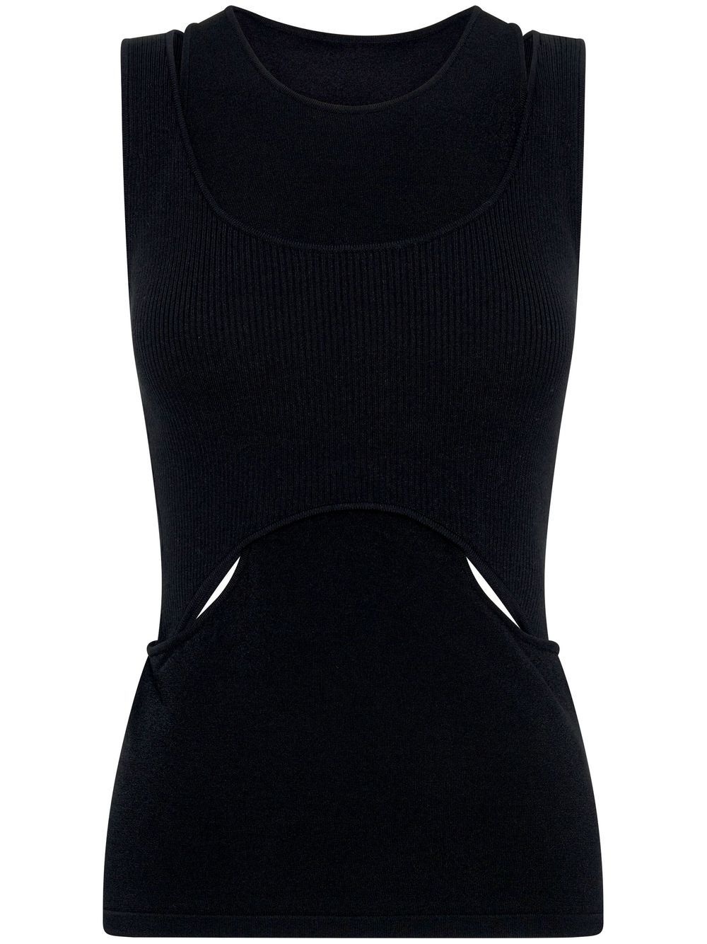 Interlink cut-out tank top black cut-out detailing sleeveless layered effect straight hem Imported Composition Body: Cotton 100% SIZE & FIT Measurement BUST 23.62 in(60 cm) LENGTH 23.22 in(59 cm) Shoulder Width 11.02 in(28 cm) WAIST 23.22 in(59 cm) Washing instructions Dry Clean Only