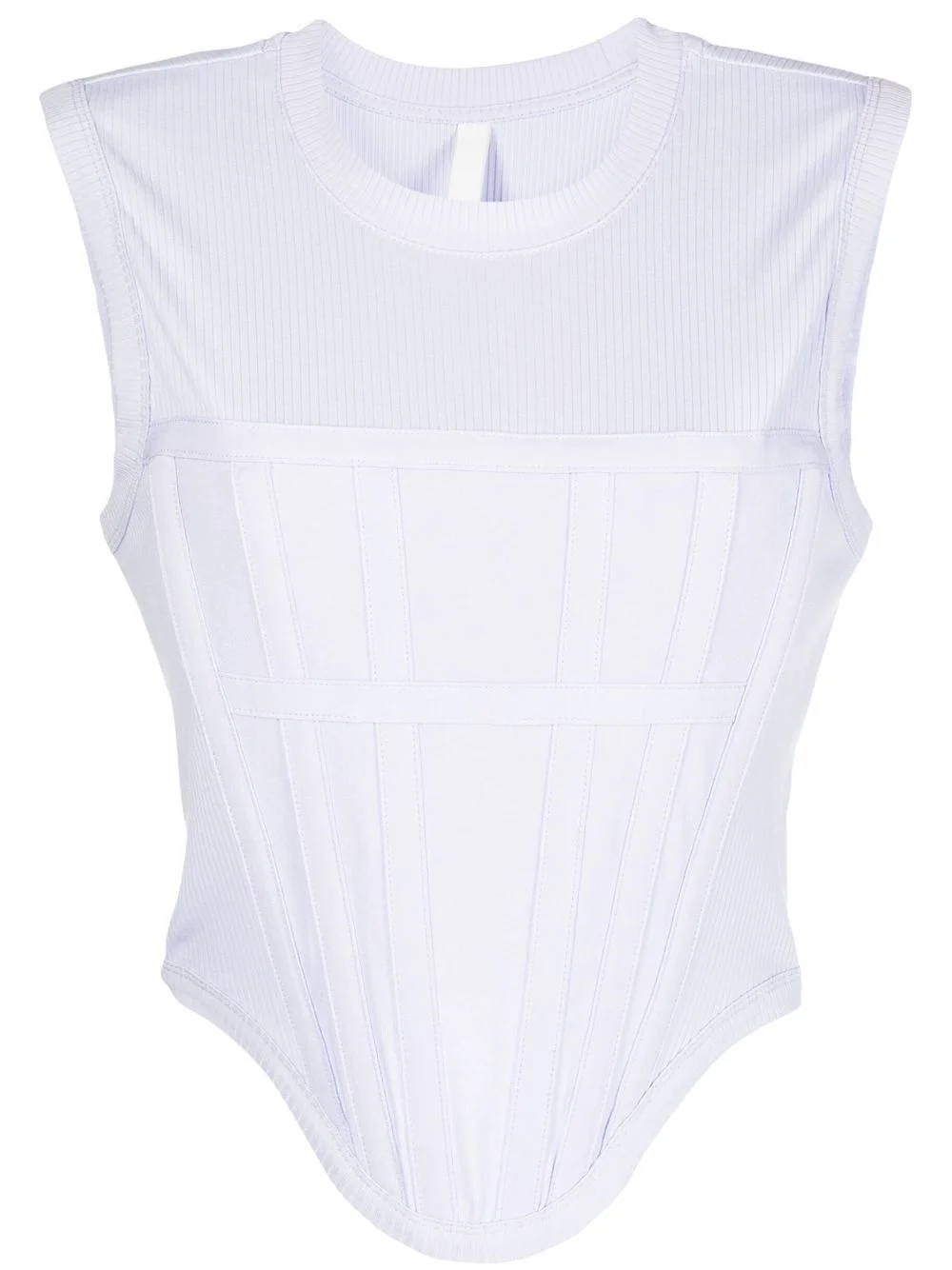 ribbed corset top Highlights - Amethyst purple - Cotton - Ribbed detailing - Round neck - Sleeveless - Cropped Imported Composition Cotton 100% SIZE & FIT Model measurements Height 5 ft 10 in(1.78 m) Bust/Chest 33.46 in(85 cm) Hips 35.43 in(90 cm) Waist 24.4 in(62 cm) FittingInformation This piece fits true to size. We recommend you get your regular size Cut for a slim fit Made with a mid-weight fabric Washing instructions Dry Clean Only