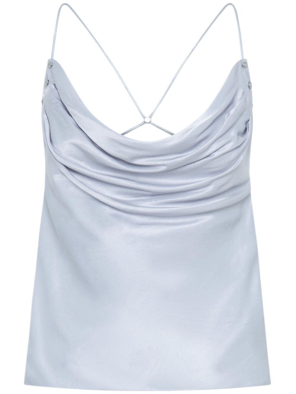 Rivet cowl-neck top Highlights - Light blue - Satin finish - Open back - Crossover straps and twist detailing to the rear - Draped design - Cowl effect - Adjustable spaghetti straps - High-low hem Imported Composition Viscose 75%, Silk 25% Washing instructions Dry Clean Only