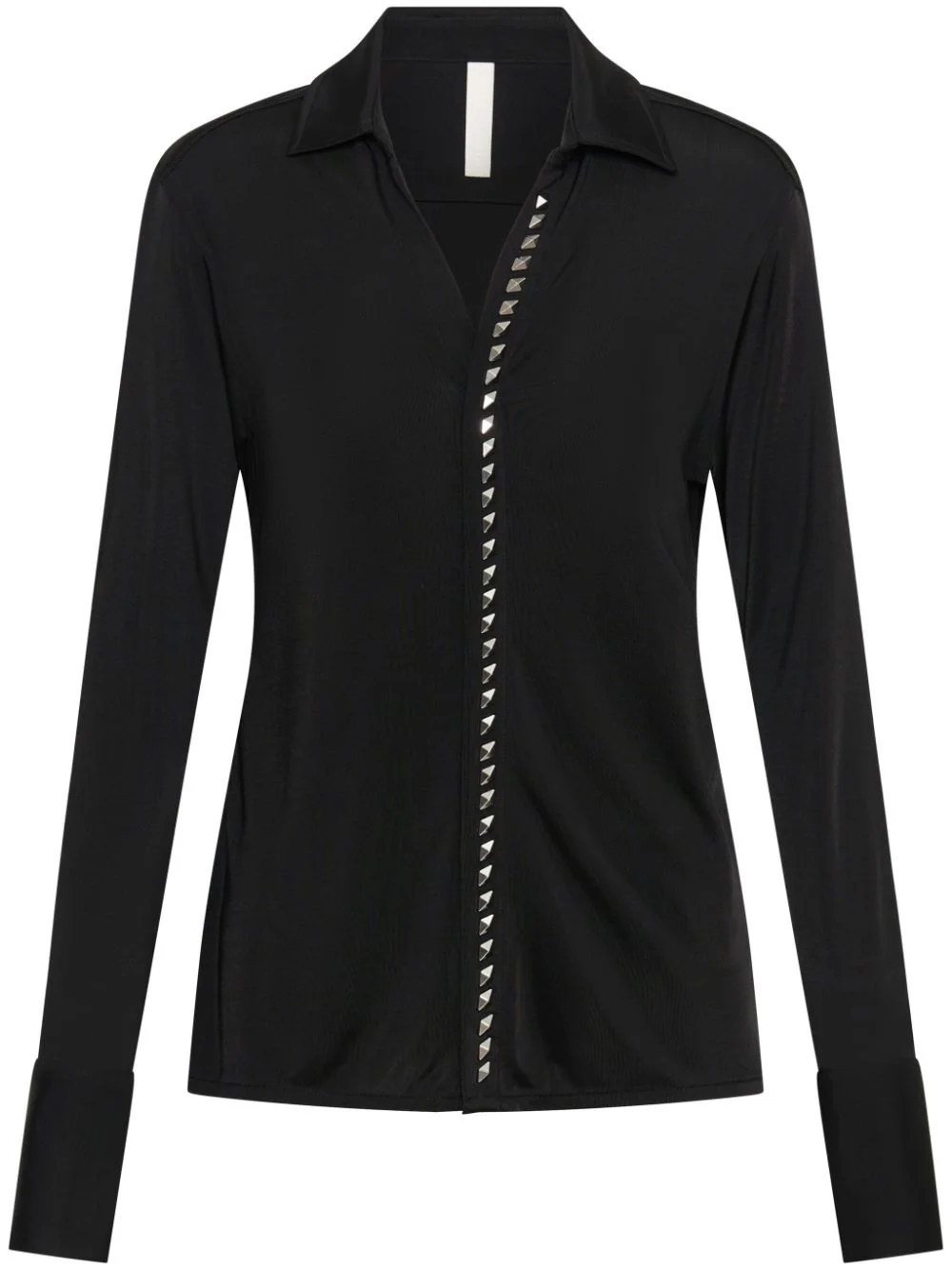 studded-placket shirt Highlights - Black - Soft jersey - Studded front placket - Pyramid studs - Silver-tone hardware - Pointed flat collar - Long sleeves - Buttoned cuffs - Straight hem Imported Composition Viscose 100% Washing instructions Read Manufacturer Guidelines