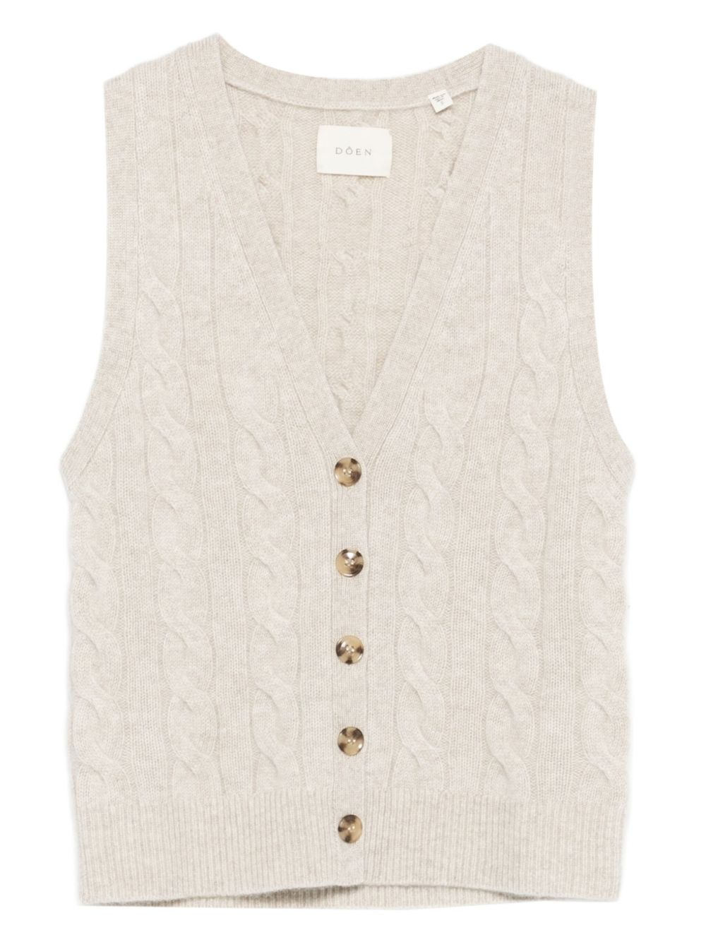 cable-knit button vest Highlights - Beige - Cable knit - V-neck - Sleeveless - Button fastening Imported Composition Fabric 100% SIZE & FIT Model measurements Height 5 ft 10 in(1.78 m) Bust/Chest 31.49 in(80 cm) Hips 37 in(94 cm) Waist 23.62 in(60 cm) Washing instructions Read Manufacturer Guidelines