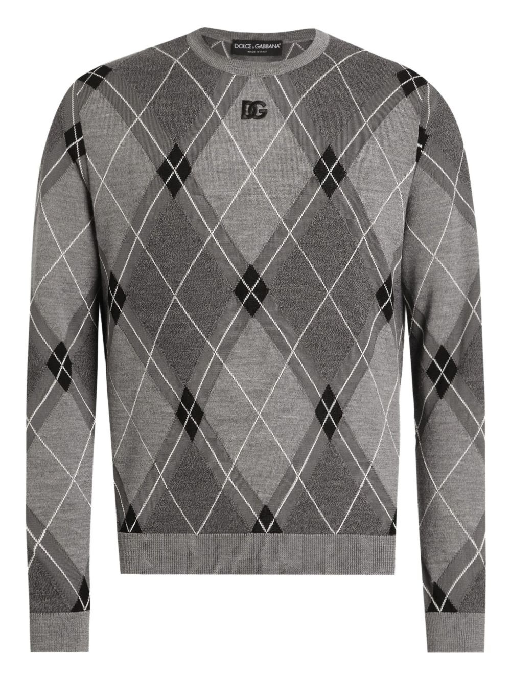 argyle-pattern logo-detail sweater Highlights - Grey - Argyle pattern - Logo detail - Long sleeves - Ribbed trim - Crew neck Made in Italy Composition Virgin Wool 68%, Silk 32% Washing instructions Read Manufacturer Guidelines
