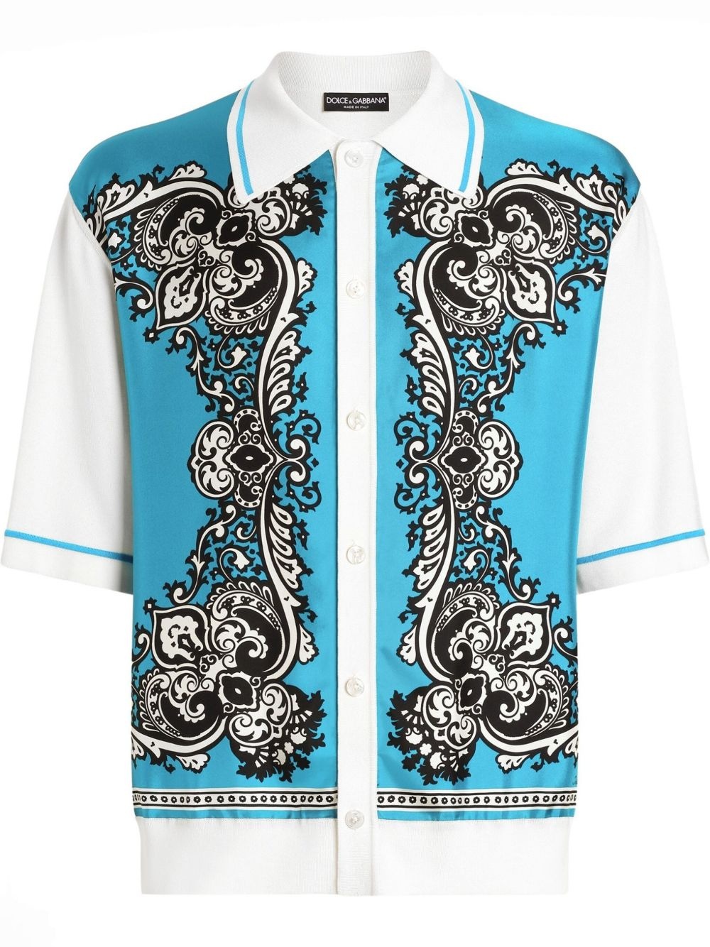 bandana-print shirt Highlights - Cyan blue - Front button fastening - Colour-block design - Stripe trim - Short sleeves Made in Italy Composition Silk 75%, Cotton 24%, Polyamide 1%