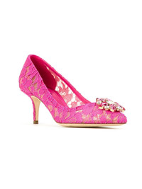 Taormina-lace crystal-embellished pumps Highlights - Dolce and gabbana live and breathe italian spirit - reflected within their collection of sleek ready-to-wear and accessories that redefine sicilian seductiveness. these fuchsia bellucci pumps from dolce & gabbana feature a pointed toe, a branded insole, a floral lace pattern, a swarovski crystal flower and a low heel. Made in Italy Composition Lining: Calf Leather 100%, Rubber 100% Sole: Rubber 100% Outer: Fabric 100% SIZE & FIT Measurement HEEL 1.96 in(5 cm)