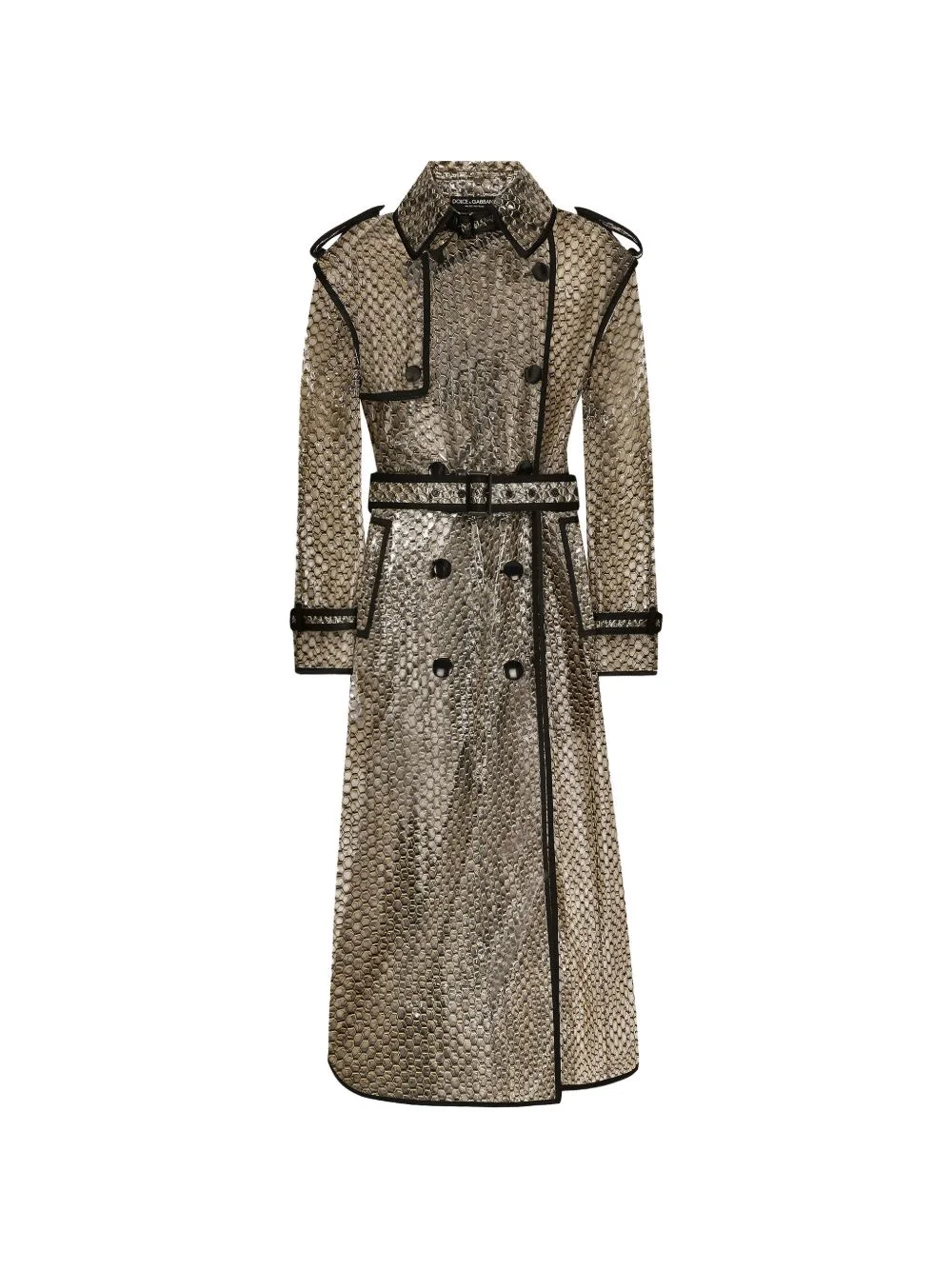 belted trench coat Highlights - Beige - All-over pattern - Double-breasted button fastening - Belt Made in Italy Composition PVC 100%, Polyester 76%, Silk 16%, Polyamide 8%
