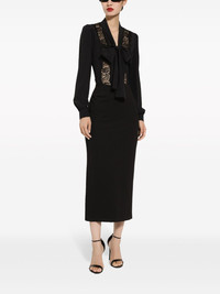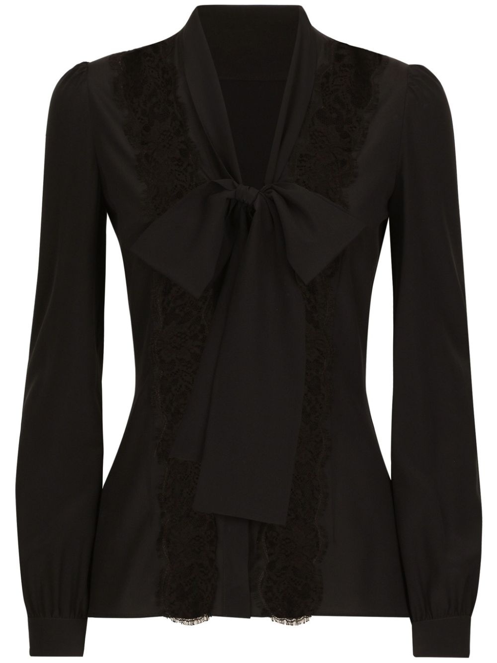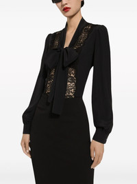 bow-detailed satin shirt Sultry signatures come together in the design of this bow-detailed blouse from Dolce & Gabbana. Crafted from a satin silk-blend, tonal black lace detailing decorates the centre of the design. Highlights - Black - Silk blend - Satin - Lace detailing - Bow detailing - Concealed front fastening - Long sleeves - Buttoned cuffs - Straight hem Made in Italy Composition Silk 73%, Cotton 14%, Elastane 7%, Polyamide 6%