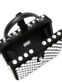 Box crystal-embellished leather bag Highlights - Black - Goatskin - Hard rectangle body - Crystal embellishment - Padlock detail - Twist-lock fastening - Single top handle - Detachable chain-link shoulder strap - Main compartment - Internal logo plaque - Internal card slot - Metal feet - Logo-engraved silver-tone hardware Made in Italy Composition Outer: Goat Skin 100% Lining: CALFSKIN 90% SIZE & FIT Model measurements Height 5 ft 11 in(1.8 m) Bust/Chest 30.7 in(78 cm) Hips 35.03 in(89 cm) Waist 24.4 in(62 cm) Measurement DEPTH 2.16 in(5.5 cm) HANDLE 7.87 in(20 cm) HEIGHT 5.11 in(13 cm) STRAP 45.66 in(116 cm) WIDTH 6.69 in(17 cm)
