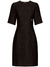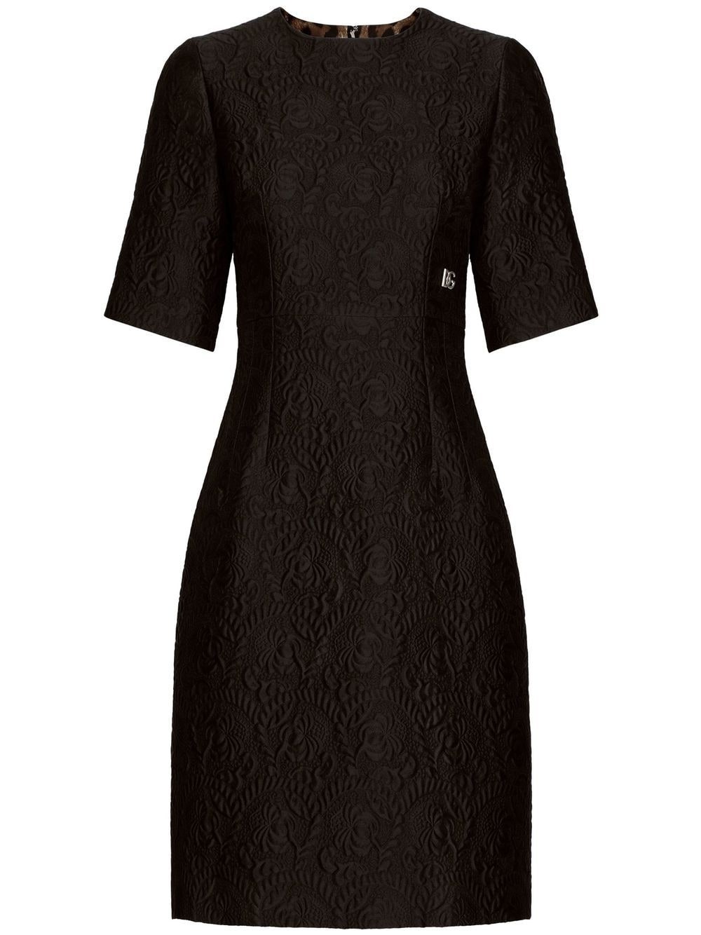 floral-jacquard midi dress This dress from Dolce & Gabbana's SS23 edit channels the brand's bold take on garments thanks to its brocade effect. Rendered in a black colourway, this knee-length piece is embroidered with the brand's initials at the side. Highlights - Black - Cotton-silk blend - Brocade effect - Embroidered logo - Crew neck - Short sleeves - Flared skirt - Straight hem - Rear zip fastening Made in Italy Composition Outer: Cotton 64%, Polyester 23%, Silk 13% Lining: Polyester 97%, Elastane 3% SIZE & FIT Measurement HIPS 35.43 in(90 cm) LENGTH 37.4 in(95 cm) WAIST 26.37 in(67 cm)