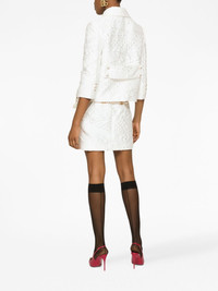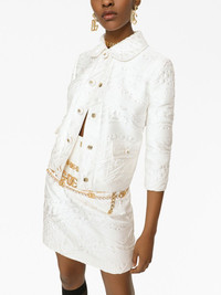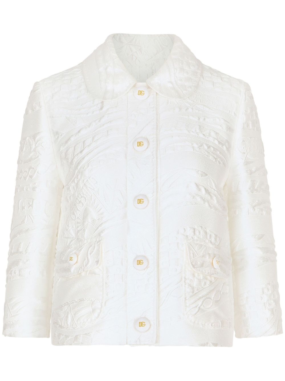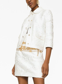 brocade rounded-collar jacket This jacket from Dolce & Gabbana is crafted in white with a brocade effect throughout. Flap pockets and press-stud buttons detail the front, each punctuated by a gold-tone DG logo plaque. Highlights - White - Stretch-silk - Rounded collar - Front press-stud fastening - Three-quarter length sleeves - Two front flap pockets Made in Italy Composition Lining: Silk 92%, Elastane 8% Outer: Nylon 27%, Silk 8% Washing instructions Read Manufacturer Guidelines
