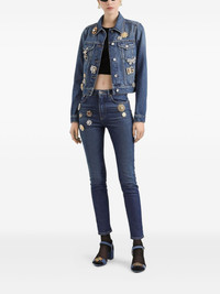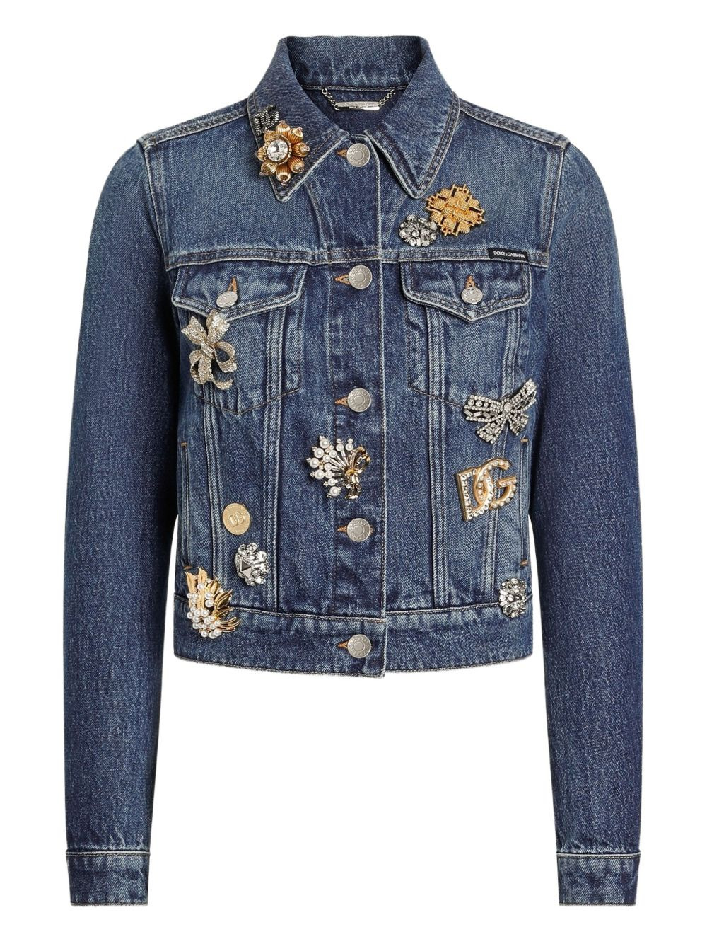 brooch-embellished denim jacket Highlights - Indigo blue - Decorative brooches - Button fastening - Point collar - Four front pockets - Long sleeves Made in Italy Composition Cotton 100% Washing instructions Read Manufacturer Guidelines