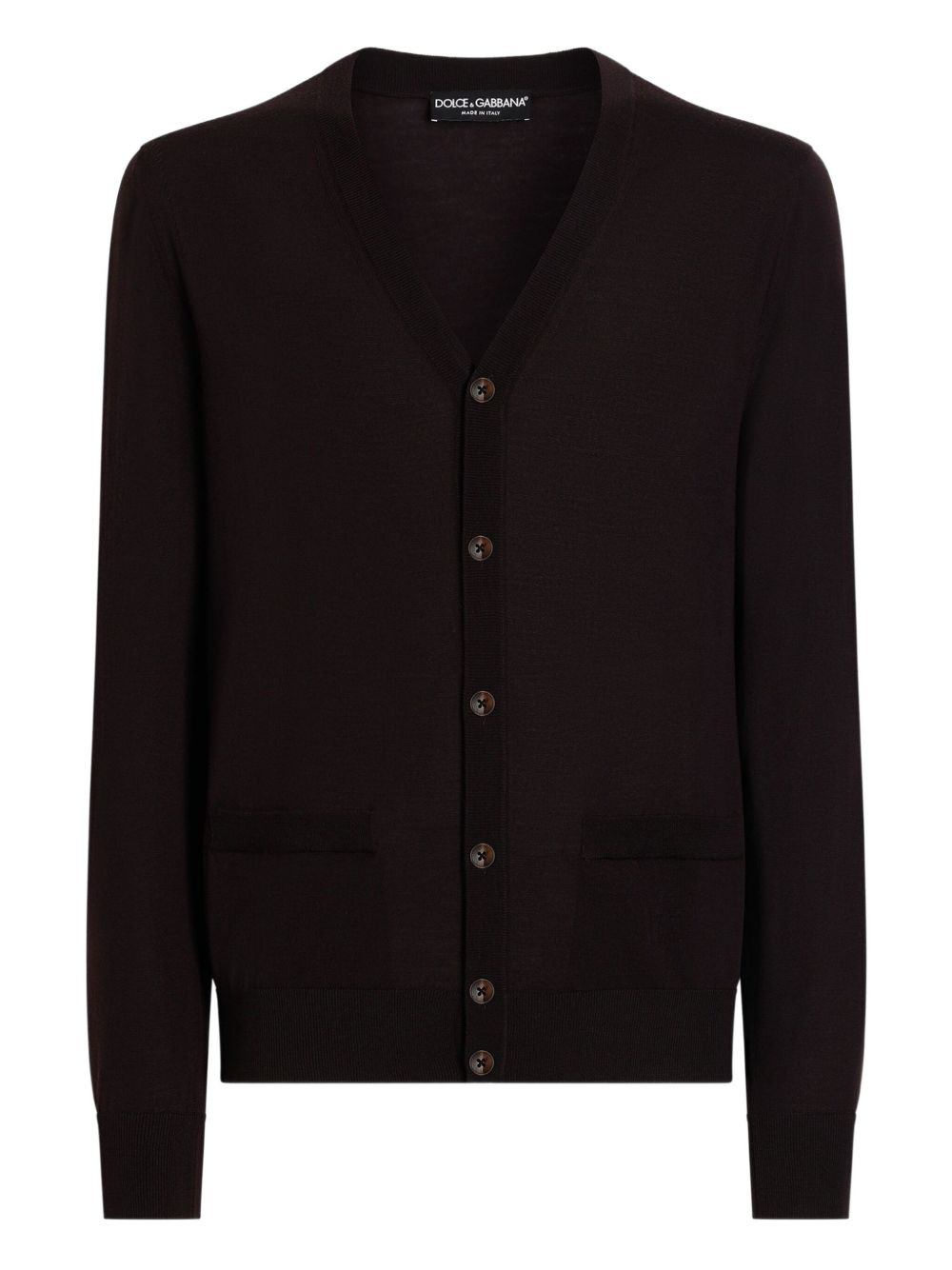 button-up cardigan Highlights - Dark brown - V-neck - Button fastening - Long sleeves - Side pockets - Ribbed trim Made in Italy Composition Virgin Wool 100% Washing instructions Read Manufacturer Guidelines