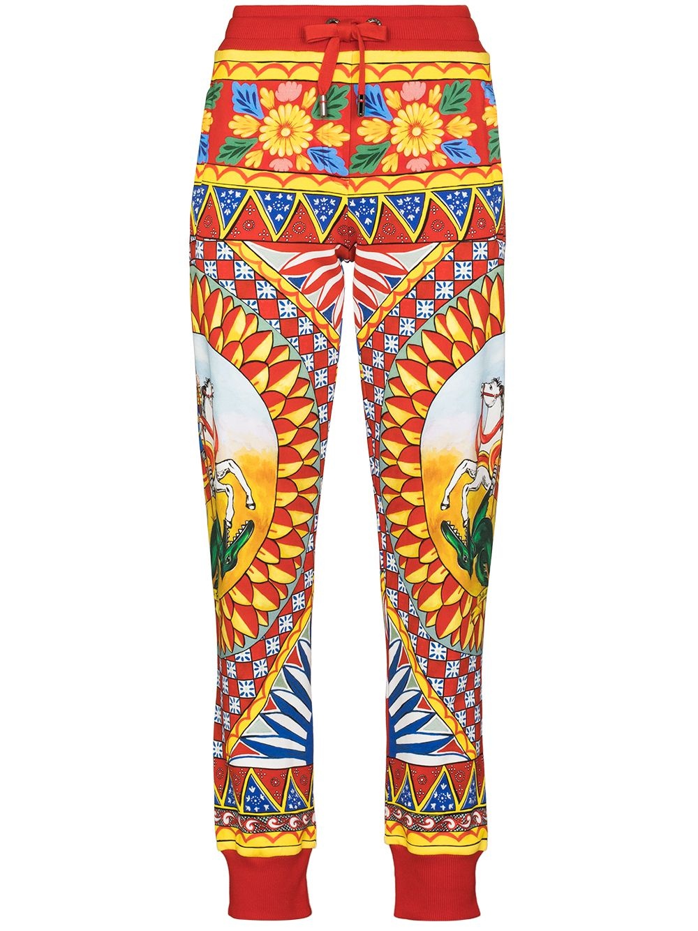 Caretto print jogging trousers Dolce & Gabbana delve into vibrant Sicilian culture with these casual jogging trousers covered with the Caretto print. Made from red cotton, this garment stands out with its bright design and tapered silhouette. Made in Italy Composition Cotton 100% SIZE & FIT Model measurements Height 5 ft 9 in(1.75 m) Bust/Chest 33.46 in(85 cm) Hips 36.61 in(93 cm) Waist 27.55 in(70 cm) FittingInformation This piece fits true to size. We recommend you get your regular size Designed to be loose over the leg with a fitted waist and hem Made with a mid-weight fabric Washing instructions Machine Wash
