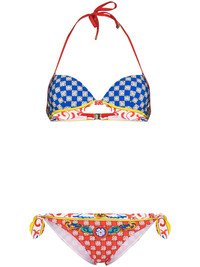 Carretto-print triangle bikini Dolce & Gabbana showcases its Sicilian roots with the vibrant Carretto print. Inspired by patterns associated with the typical Sicilian horse-drawn cart, the joyful print adorns this bikini set that stays true to the house's bold aesthetic. Highlights - Multicolour - Signature carretto print - Stretch-design - Top: - Triangle cup - Halterneck tie fastening - Rear clip fastening - Bottoms: - Side tie fastening - Mid-rise - Be mindful to try on swimwear over your own garments. Made in Italy Composition Polyamide 75%, Elastane 25% SIZE & FIT Model measurements Height 5 ft 9 in(1.76 m) Bust/Chest 33.07 in(84 cm) Hips 38.58 in(98 cm) Waist 24.8 in(63 cm) FittingInformation This piece fits true to size. We recommend you get your regular size Made with a mid-weight stretch fabric Washing instructions Hand Wash