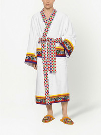 terry bath robe Made in Italy from plush cotton terry cloth, this robe from Dolce & Gabbana is adorned with a folklore-inspired Carretto Siciliano design, found throughout the house's collection and defined by its lively colour scheme. Highlights - White/multicolour - Cotton - Contrasting trim - Shawl lapels - Belted waist - Two front patch pockets - Long sleeves - Straight hem - When buying this unisex item, keep in mind that it is graded in standard men's sizing Made in Italy Composition Cotton 100%